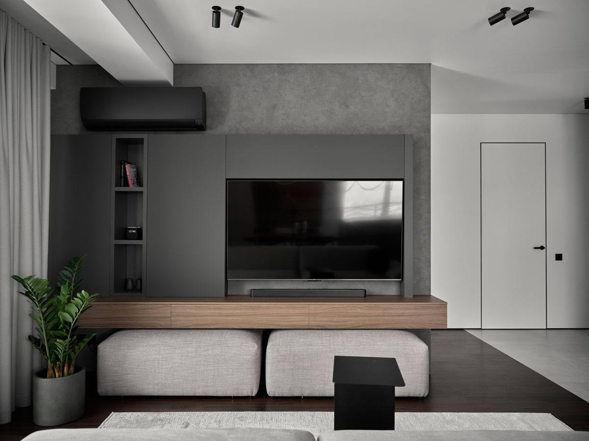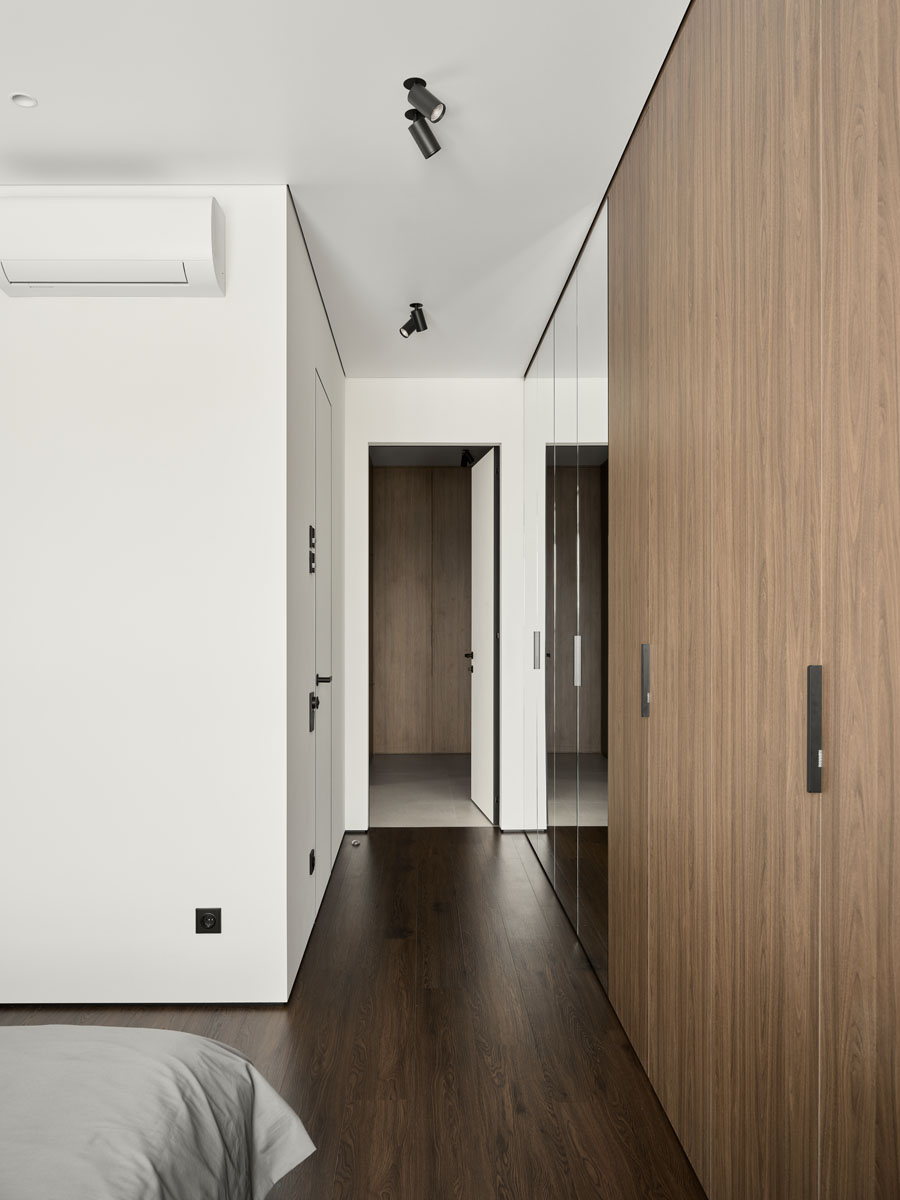 За внешним минимализмом и аккуратными стыками скрывается современная начинка: элементы умного дома, электрокарнизы, тёплый пол.